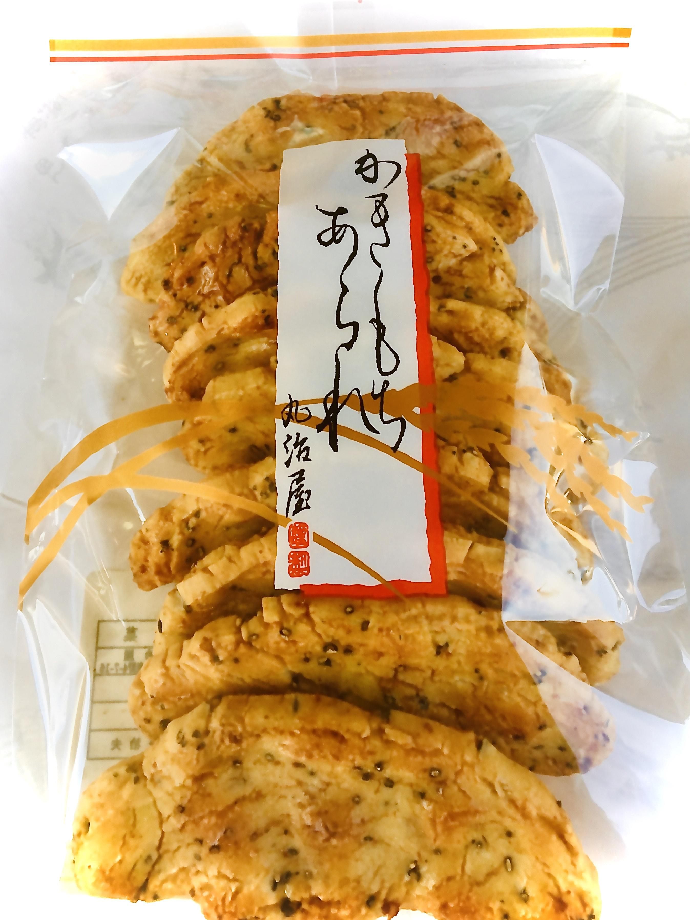 三日月にカットしたごま入りお餅を、ソフトに焼いたおかき。